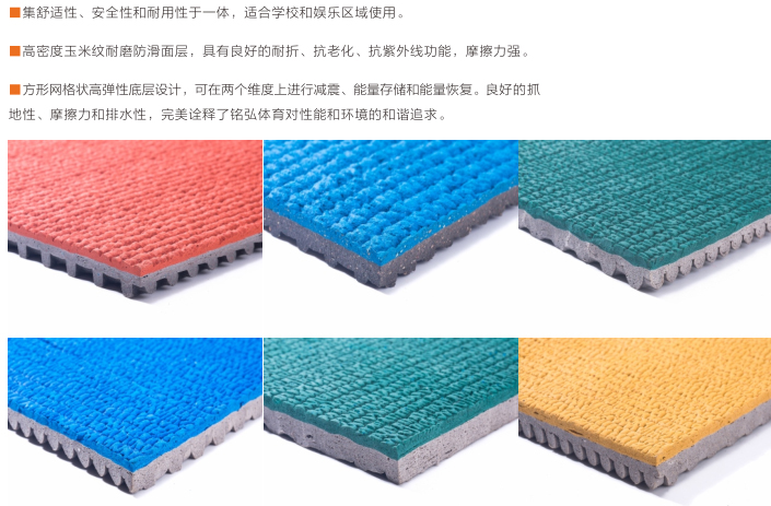 l多色彩效果: 不眩目多色彩組合,增添了運動場的美觀,帶給運動參與者愉悅的身心體驗。
