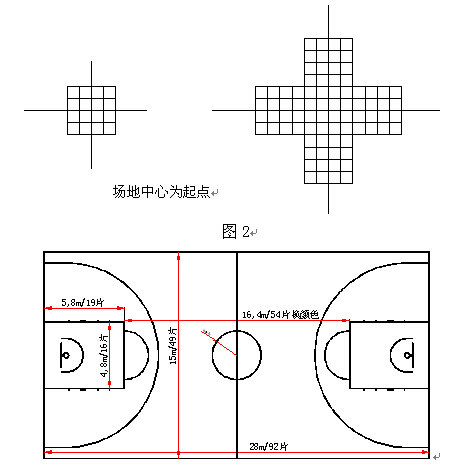 四、在場地中心點開始安裝地板,以中心線為起點由內向外安裝,先安裝場地基本結構十字架到兩端見(圖2),再由內向外安裝整個場地,場地面積所需地板數量見(圖),