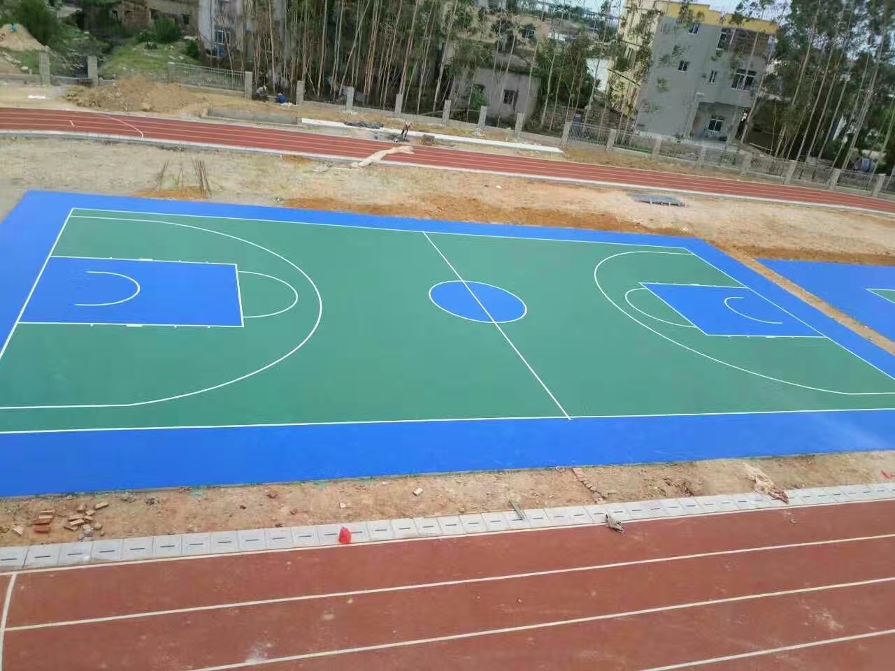 5、膠乳涂布后兩天,經檢測達到要求后,即開始鋪膠工作。第一層為混合型聚氨酯,按國家標準≤30%再生膠糠,膠糠為18#-22#,厚度為9mm。混合型聚氨酯鋪設完畢,經檢測無起鼓、離層及疏松等現象后,再涂布一層su-102膠做面層處理,它具有結合作用,能使鋪設膠面產生微細孔隙,能使之與下一層的鋪設結合得更加牢固。Su-102膠表面處理后,即刻攤鋪一層2.5-2.8mm全塑型聚氨酯膠漿。在膠漿固化到拉絲狀時,即撒膠粒,完成該道工序后即用掃粒機清掃表面懸浮的多余膠粒。