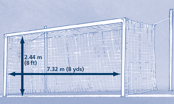兩根球門柱和橫梁具有不超過12厘米(5英寸)的相同的寬度和厚度。球門線與球門柱和橫梁的寬度是相同的。球門網(wǎng)可以系在球門及球門后面的地上,并要適當(dāng)撐起以不影響守門員。