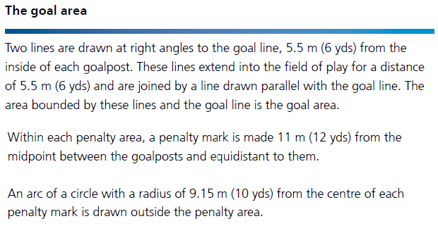 從距每個球門柱內(nèi)側(cè)5.5米(6碼)處,畫兩條垂直于球門線的線。這些線伸向足球比賽場地內(nèi)5.5米(6碼),與一條平行于球門線的線相連接。由這些線和球門線組成的區(qū)域范圍是球門區(qū)。