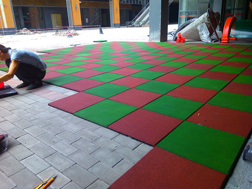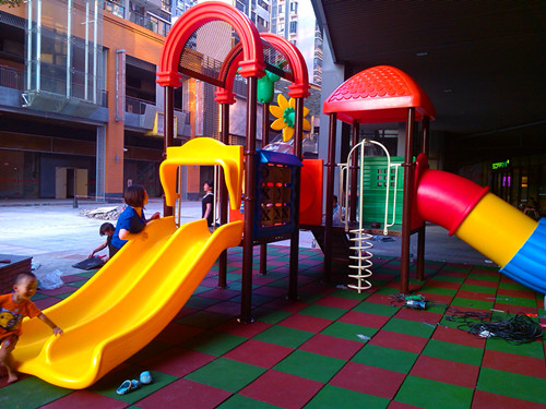 兒童游樂場地面考慮到兒童安全,都必須使用安全地墊,可選橡膠安全地墊或EPDM顆粒地墊。佛山創意產業園業主居住活動場區域采用25mm橡膠地墊鋪設,上面為兒童樂園組合滑梯。