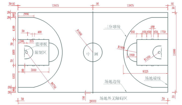 1 球場:是一個長方形的堅實平面,無障礙物。對于國際籃聯主要的正式比賽,球場的丈量要從界線的內沿量起。對于所有其它比賽,國際籃聯的適當部門,有權批準符合下列尺寸范圍內的現有球場:長度減少4米,寬度減少2米,只要其變動互相成比例。天花板或最低障礙物產高度至少7米。球場照明要均勻,光度要充足。燈光設備的安置不得妨礙隊員的視覺。所有新建球場的尺寸,要與國際籃聯的主要正式比賽所規定的要求一致:長28米,寬15米。 2 線條:寬度為0.05米(5厘米) 。